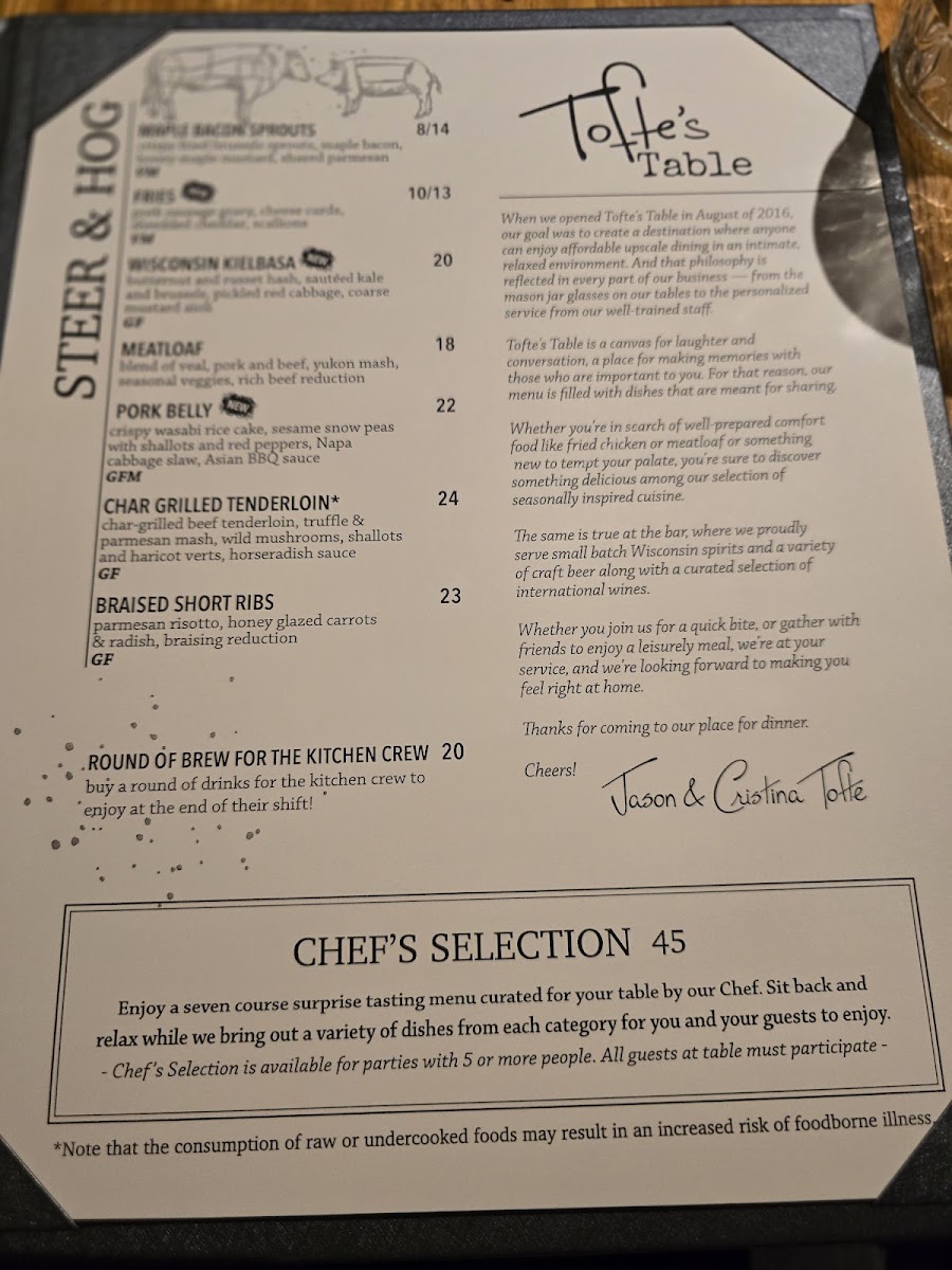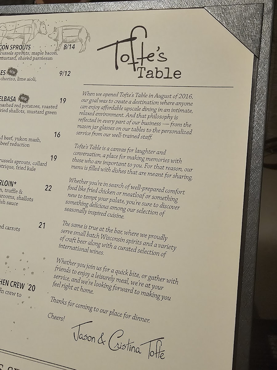 Welcome to Tofte's Table, a culinary gem nestled in Waukesha, WI. This inviting dining destination celebrates flavor and creativity through its meticulously crafted menus. From the moment you step in, you're greeted by a warm atmosphere and attentive service, setting the stage for an unforgettable meal.